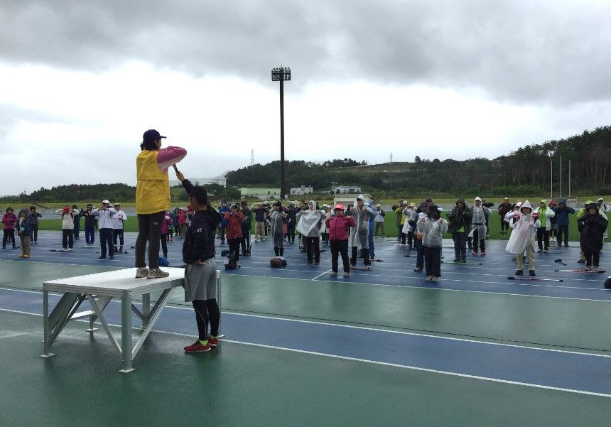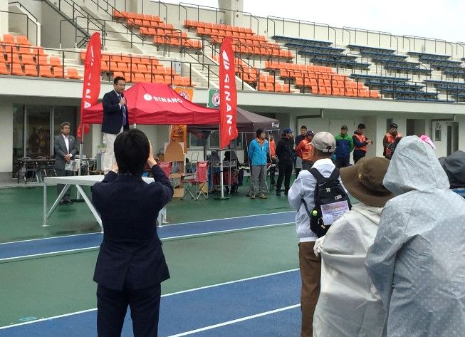 天候はあいにくのお天気となりましたが、台風も思ったより近づかず、小雨のコンディションでのスタートとなりました。スタート前には参加者の皆さんで元気よく準備運動をされ、スタートをされました。